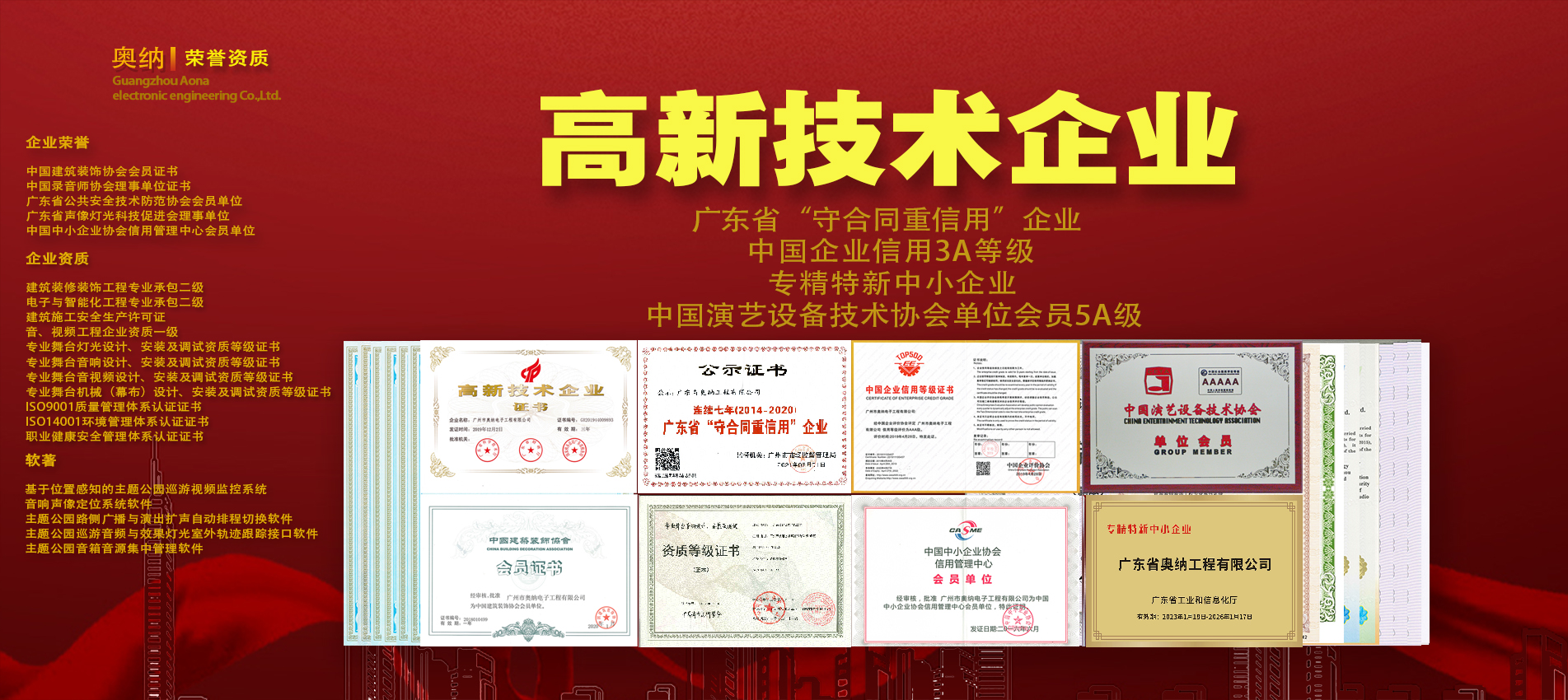 公司現(xiàn)擁有多項資質(zhì)證書,獲得專利和軟著近百項,并先后榮獲百強(qiáng)工程商、優(yōu)秀文旅演藝獎等獎項,在科學(xué)化、標(biāo)準(zhǔn)化、規(guī)范化方面深得客戶信賴。公司參與建設(shè)的“華南理工大學(xué)國際校區(qū)圖書館”榮獲2022-2023年度中國建設(shè)工程魯班獎。